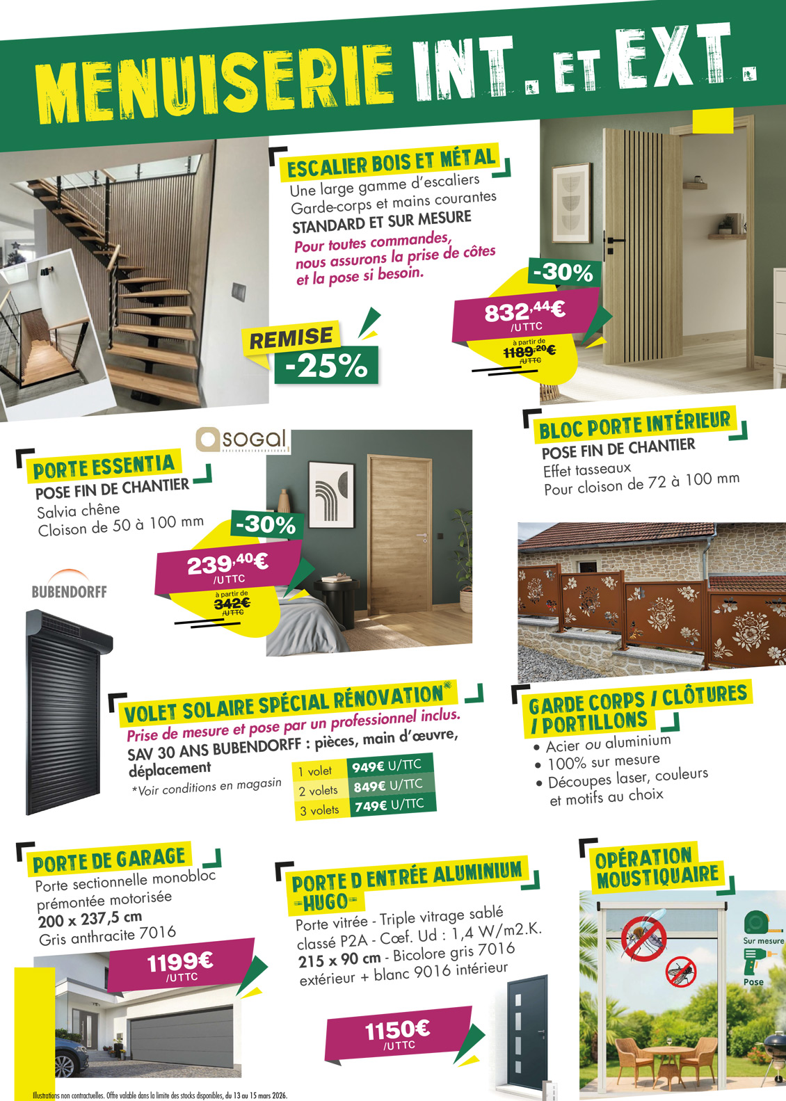 MENUISERIE INTÉRIEURE et EXTÉRIEURE Illustrations non contractuelles. Offre valable dans la limite des stocks disponibles, du 13 au 15 mars 2026.